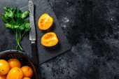 Zdjęcie "Składniki Sałatka cesarska, sałata rumuńska, pomidory wiśniowe, jajka, parmezan, czosnek, pieprz. Czarne tło. Widok góry. Przestrzeń kopiowania." może być wykorzystywane do celów osobistych i komercyjnych zgodnie z warunkami zakupionej licencji Royalty-free. Obraz jest dostępny do pobrania w jakości wysokiej rozdzielczości do 5760x3840.