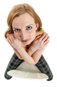 Lekko zwinięta na całej długości młoda blondynka w czarnej, przezroczystej, kolanowej sukience i czarnej, wysokiej temperaturze, jedna ręka na podniesionym obszyciu sukienki na białym tle.