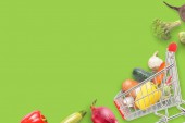 Sztandar. Płaska kompozycja świecka z darowizn żywności i leków na zielonym tle z copyspace - makaron, świeże warzywa, konserwy, bagietka, olej do gotowania. Koncepcja banku żywności, ukierunkowanie selektywne
