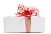 Srebro prezent z czerwoną wstążką na białym tle nad białym