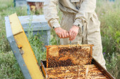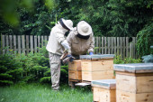pszczelarz w ochronnej odzieży roboczej w masce, zamyka pasiekę