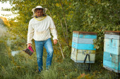 Zdjęcie "pszczelarz w ochronnej odzieży roboczej w masce, zamyka pasiekę" może być wykorzystywane do celów osobistych i komercyjnych zgodnie z warunkami zakupionej licencji Royalty-free. Obraz jest dostępny do pobrania w jakości wysokiej rozdzielczości do 5760x3840.