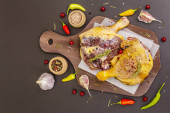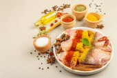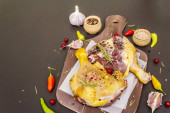 Zdjęcie "Przygotowanie surowe piersi kaczki z soli morskiej, świeże rozmaryn, czarny pieprz, sucha lawenda i wino. Mięso drobiowe, naturalny produkt BIO, ptactwo domowe. Prowansja styl, kamień betonowe tło, widok z góry" może być wykorzystywane do celów osobistych i komercyjnych zgodnie z warunkami zakupionej licencji Royalty-free. Obraz jest dostępny do pobrania w jakości wysokiej rozdzielczości do 5760x3840.