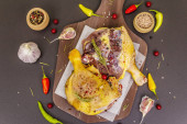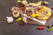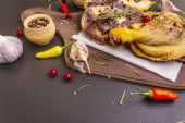 Surowe piersi kaczki ze świeżą zielenią i aromatycznymi przyprawami. Mięso drobiowe, naturalny produkt BIO, ptactwo domowe. Kamienne betonowe tło, zbliżenie