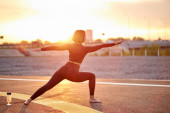 widok z boku na atrakcyjne fit kobieta robi ćwiczenia jogi o świcie
