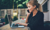 Uśmiechnięta kobieta freelancer w luźnej bluzce za pomocą laptopa podczas rozmowy telefonicznej, siedząc przy stole z filiżanką kawy pracując zdalnie w nowoczesnej stołówce