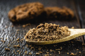 drewniana łyżka stosowana w kuchni rustykalnej, z czekoladą w proszku. Rustykalny drewniany stół, domowe ciasteczka czekoladowe w tle