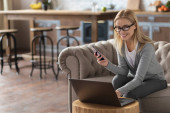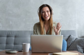 Zdjęcie "Piękna młoda blondynka pracująca z laptopem w domu lub mająca czat wideo, machająca ręką na ekranie laptopa. Praca w domu lub praca w domu" może być wykorzystywane do celów osobistych i komercyjnych zgodnie z warunkami zakupionej licencji Royalty-free. Obraz jest dostępny do pobrania w jakości wysokiej rozdzielczości do 5760x3840.