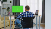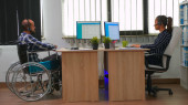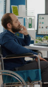 Menedżer na wózku inwalidzkim doradza w sprawie projektu partnerowi
