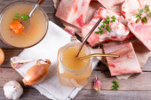 Miska z bulionem wołowym, kości i świeże warzywa na stole, dieta paleo. Widok z góry