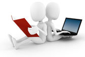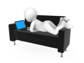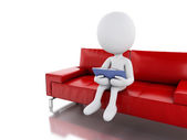 3D człowiek z laptopa siedząc na czerwonej kanapie