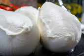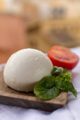 Świeże ręcznie robione miękkie włoskie sery z Kampanii, białe kulki sera bawolego mozzarella z krowiego mleka gotowe do spożycia z bliska