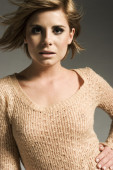 Happy Blond kobieta siedzi z uśmiechem