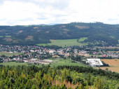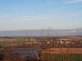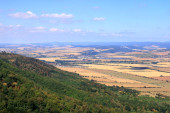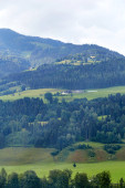widok na małe miasteczko na polach, krajobraz rolniczy, okrągłe bele słomy na polach, lasy i wzgórza w tle, turystyka letnia, niebo z białymi chmurami,