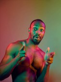 Młody afrykańsko-amerykański portret mężczyzny odizolowany na żółtym tle studia, wyraz twarzy. Piękny męski portret półdługości z przestrzenią do kopiowania.
