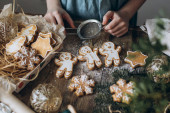 Prezent świąteczny piernik na ciemnym tle. Kobieta trzyma świąteczne pierniki z cukrem pudrem. Widok z góry