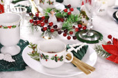 Ustawienie stołu świątecznego z piękną zastawą stołową w tradycyjnych biało-czerwono-zielonych kolorach