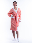 kobieta w jasnym szlafroku reklamuje szczegóły odzieży na białym tle. Zrobione w studiu z bliska.