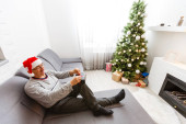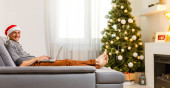 wesoły człowiek siedzi na kanapie i za pomocą laptopa w pobliżu choinki w domu