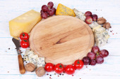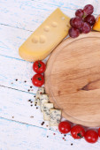 smaczny ser pleśniowy i chleb na starym drewnianym stole