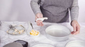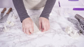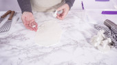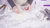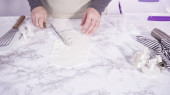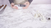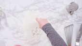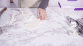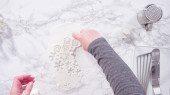 Krok po kroku. Wycinanie płatków śniegu za pomocą wycinaków do ciasteczek z białego fontanny na marmurowym blacie.