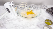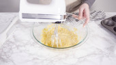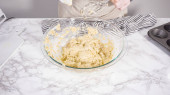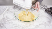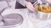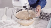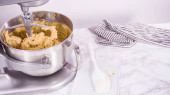 Krok po kroku. Składniki mieszające w stojącym mikserze elektrycznym do pieczenia ciasteczek z masłem orzechowym.