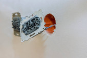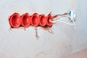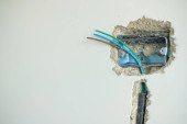 Nowa instalacja elektryczna, gniazdka i kable elektryczne na ścianie, koncepcja renowacji. Instalacja przewodów elektrycznych.