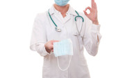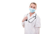 Młody lekarz w białym mundurze i stetoskopie noszący maskę na izolowanym tle