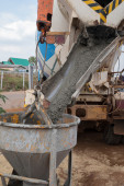 Pracownik miesza cement z piaskiem bezpośrednio w pickupie. Przygotowanie mieszaniny. Robotnik budowlany, piasek i cement zmieszane w pickup.