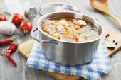 Saucepan z bulionem z chochlą na stole. Bulion kostny