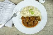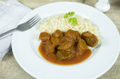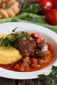 Gulasz z marchewką, grzybami i ziemniakami puree.