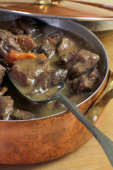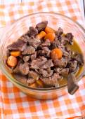 a cuisine photo of beef, mushrooms and carrot stewed in a dish