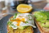 Zdrowe śniadanie. Świąteczny brunch. Kanapka z awokado z jajkiem smażonym i świeżym ogórkiem sałatkowym z rukolą na zdrowe śniadanie lub przekąskę.