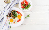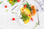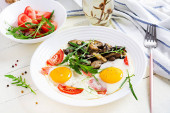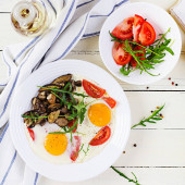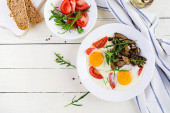 Smaczne śniadanie - smażone jajka, leśne grzyby, pomidory i rukola. Jedzenie na lunch. Widok z góry, nad głową, przestrzeń kopiowania