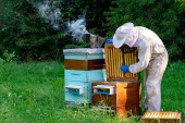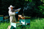 Zdjęcie "Pszczelarz w ochronnej oprawie do inspekcji odzieży roboczej w pasiece. Pszczelarz trzyma w rękach plaster miodu ze świeżym miodem." może być wykorzystywane do celów osobistych i komercyjnych zgodnie z warunkami zakupionej licencji Royalty-free. Obraz jest dostępny do pobrania w jakości wysokiej rozdzielczości do 5760x3840.