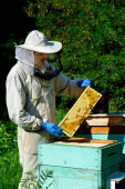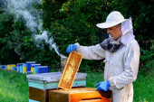 Pszczelarz w ochronnej oprawie do inspekcji odzieży roboczej w pasiece. Pszczelarz trzyma w rękach plaster miodu ze świeżym miodem.