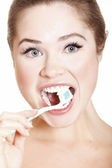 portret młodej kobiety uśmiechający się z łyżeczką w ustach