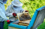 Pszczelarz na pasiece. Pszczelarz pracuje z pszczołami i uli na pasiece. Koncepcja pszczelarstwa.
