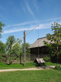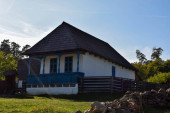 Tradycyjne rumuńskie gospodarstwo domowe z drewnianym domem i fontanną na podwórku