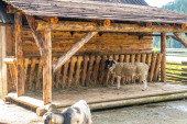 Zdjęcie "Tradycyjna rumuńska stajnia chłopska z strzechą. Architektura narodowa. Owce pasące się na podwórku w słoneczny ciepły wiosenny dzień." może być wykorzystywane do celów osobistych i komercyjnych zgodnie z warunkami zakupionej licencji Royalty-free. Obraz jest dostępny do pobrania w jakości wysokiej rozdzielczości do 5760x3840.