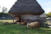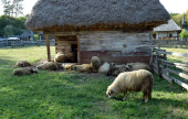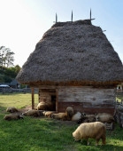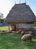 Tradycyjna rumuńska stajnia chłopska z strzechą. Architektura narodowa. Owce pasące się na podwórku w słoneczny ciepły wiosenny dzień.