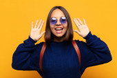 Latynoska kobieta uśmiechnięta, szczęśliwa, beztroska i zadowolona, wskazująca na koncepcję lub pomysł na przestrzeń do kopiowania z boku
