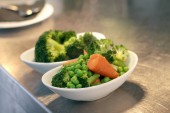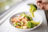 Brokuły do zbierania widelców z brokułów i sałatki z kurczaka obok okna
