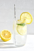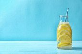 Woda sodowa z plastrami cytryny i kostkami lodu na jasnoniebieskim drewnianym stole