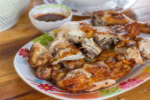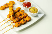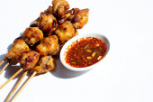 Grillowana wieprzowina lub wieprzowina satay z sosem orzechowym lub sosem słodko-kwaśnym, tajskie jedzenie