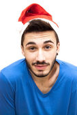 Mężczyzna z brodą w czarnym swetrze z dzianiny i kapeluszem Mikołaja na jasnoróżowym fioletowym tle. Boże Narodzenie nowy sztandar roku z człowiekiem w czerwonym kapeluszu Mikołaja.