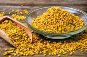 Zdjęcie "Pyłek pszczeli w drewnianej łyżce i plastrze miodu. Produkty pszczelarskie. Apiterapia" może być wykorzystywane do celów osobistych i komercyjnych zgodnie z warunkami zakupionej licencji Royalty-free. Obraz jest dostępny do pobrania w jakości wysokiej rozdzielczości do 5760x3840.
