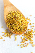 Pyłek pszczeli w drewnianej łyżce i plastrze miodu. Produkty pszczelarskie. Apiterapia