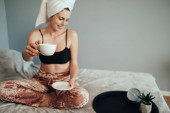 Rozkoszna pani z kubkiem w rękach ciesząca się porankiem w kuchni