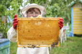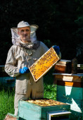 Pszczelarz trzymający plaster miodu pełen pszczół. Pszczelarz w ochronnej odzieży roboczej badający szkielet plastra miodu w pasiece. Prace na pasiekach wiosną